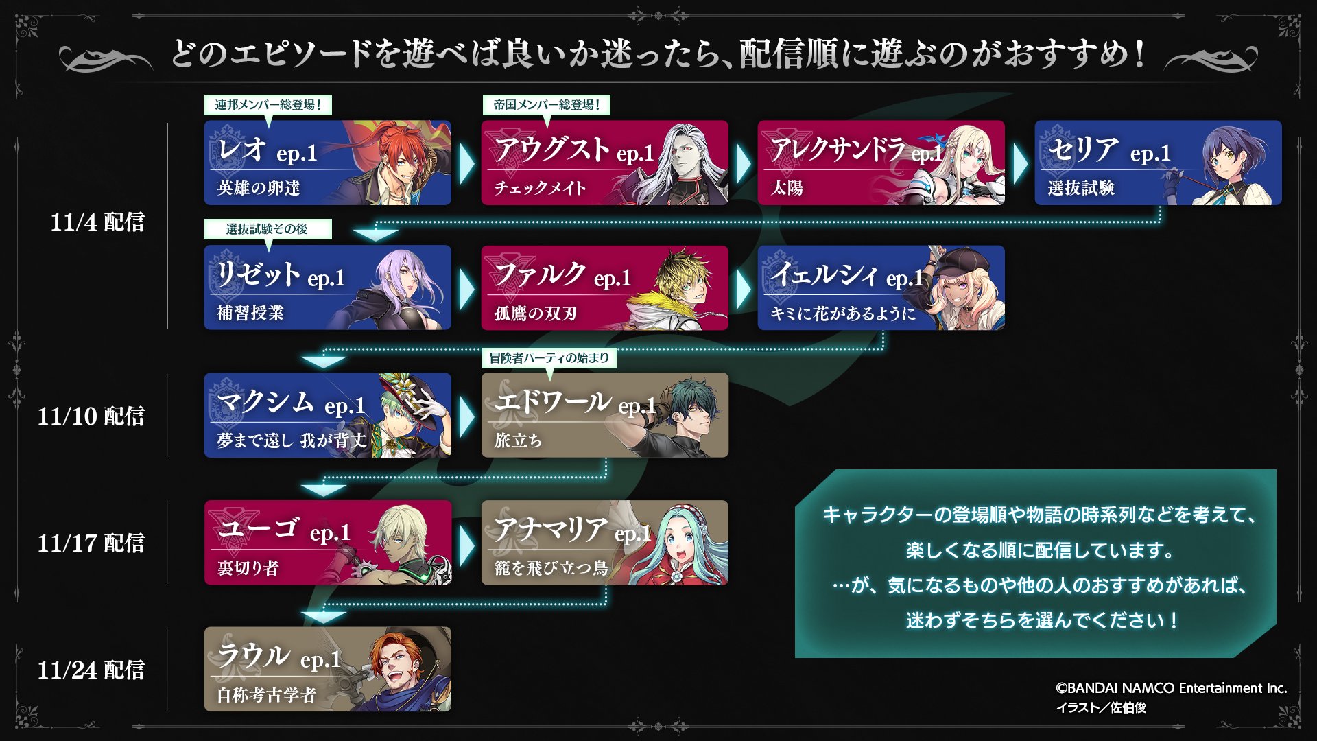 テイルズ オブ ルミナリア アニメ公開中 Ver 1 0 9から レオep 1チャプター2クリア時に配信済みの全エピソードがプレイ可能になりました どのキャラからでもプレイできるのは良いけれど どれからやれば良いかわからない という方に